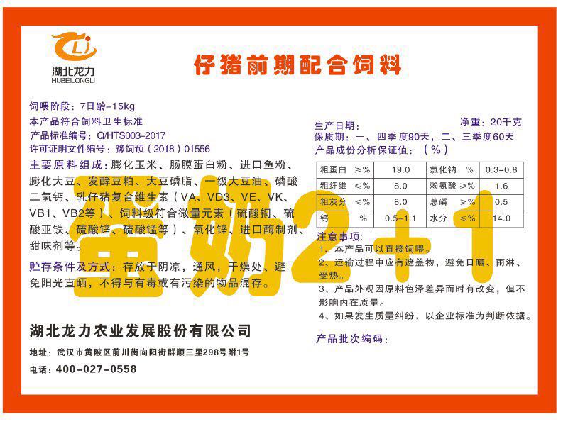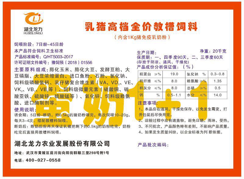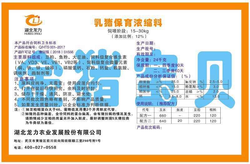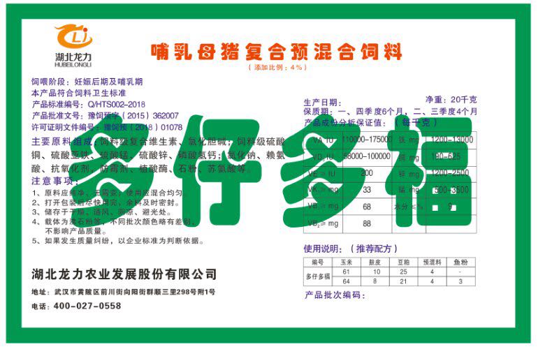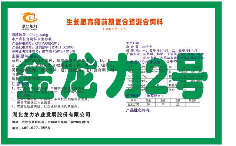 湖北龍力農(nóng)業(yè)發(fā)展股份有限公司坐落于武漢市黃陂區(qū)前川街向陽街群順三里298號附1號。公司成立于2014年6月,公司自成立以來把“創(chuàng)全球最大養(yǎng)豬綜合服務”為企業(yè)愿景。致力于打造教保料品牌”作為公司發(fā)展的明確目標。公司一直致力于豬營養(yǎng)的研究和開發(fā),積極與國內(nèi)外高校和科研機構合作,推廣養(yǎng)豬技術、動物營養(yǎng)新概念,向世界農(nóng)牧企業(yè)學習與合作。公司采用國內(nèi)先進的生產(chǎn)工藝,選擇高精度電子配料秤,高均勻度、無殘留混合機等先進設備....